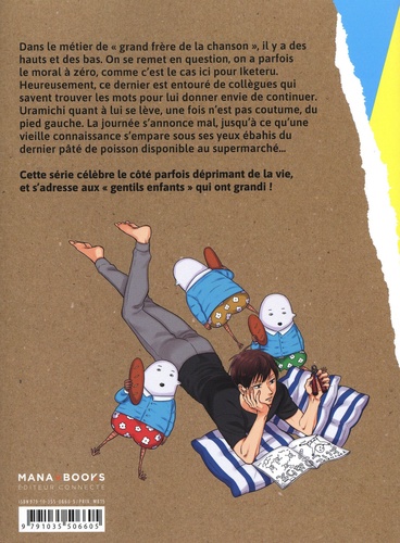 Un hymne cynique à la vie d'adulte ! Dans le métier de " grand frère de la chanson ", il y a des hauts et des bas. On se remet en question, on a parfois le moral à zéro, comme c'est le cas ici pour Iketeru. Heureusement, ce dernier est entouré de collègues qui savent trouver les mots pour lui donner envie de continuer. Uramichi, quant à lui, se lève, une fois n'est pas coutume, du pied gauche. La journée s'annonce mal, jusqu'à ce qu'une vieille connaissance s'empare sous ses yeux ébahis du dernier pâté de poisson disponible au supermarché... Cette série célèbre le côté parfois déprimant de la vie, et s'adresse aux " gentils enfants " qui ont grandi !