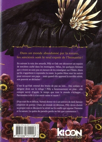 Dans un monde abandonné par la nature, les sorcières sont le seul espoir de l'humanité! En suivant la voix des amurds, Pilly et Oak ont découvert un repaire de sorcières caché dans les montagnes. Hélas, les quelques femmes qui y vivent ne sont pas en mesure de les renseigner sur l'Eden. Alors qu'ils s'apprêtent à reprendre la route, la petite Hina veut les suivre pour retrouver son papa... mais quand elle apprend la terrible vérité, son pouvoir se déchaîne ! C'est là qu'Oak entend des bruits de pas au loin... Des soldats se dirigent droit sur le refuge ! Pilly a heureusement un plan : elle compte servir d'appât, le temps que tout le monde s'échappe... Parviendra-t-elle à s'en sortir saine et sauve ? D'un trait fin et délicat, Yumeji donne vie à un univers de dark fantasy empreint de poésie ! Dans un monde en détresse, Pilly devra choisir sa propre voie et découvrir la vérité sur le conflit qui oppose l'homme et la nature. La quête du paradis perdu ne fait que commencer !