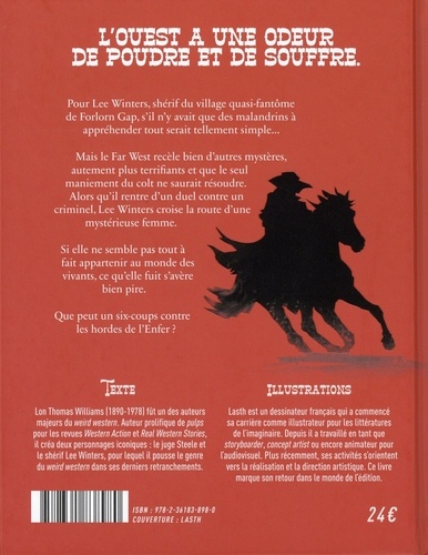 Initiée en 2017 avec Tout au milieu du monde, la "Bibliothèque dessinée" , notre collection de romans graphiques, aujourd'hui forte de plus d'une dizaine de titres, a fait peau neuve en 2022 en adoptant un nouveau format (similaire à ceux des BD), plus grand, sous couverture cartonnée, avec dos rond et vernis gonflant. Proposant habituellement une collaboration entre écrivain et graphiste/dessinateur, c'est cette fois une texte de Lon T. Williams, auteur de pulps dans les années 1950, qui est mis en images par le dessinateur Lasth. Genre très prisé en bande-dessinée, il nous paraît opportun d'ajouter le western à notre catalogue en réimaginant ce texte de pure littérature populaire sous format graphique pour donner vie à ces aventures fantastiques. Loin d'un simple hommage aux pulps d'époque, Lasth a réfléchi à un decoupage très nerveux, inspiré à la fois du cinéma et surtout du manga, pour faire de ce volume un ouvrage tout à fait dans son temps. Cette collaboration s'inscrit dans la continuité de notre politique de "légitimité" de cette collection vis-à-vis des rayons BD, à savoir faire appel à de véritables bédéastes, reconnus ou montants : viendront ensuite David De Thuin, Laureline Mattiussi, François Ayrolles, Caro et Giuseppe Liotti. La couverture est mise en page de manière à être identifiée du premier coup d'oeil comme étant du roman graphique : elle rappelle par exemple celles de l'univers Hellboy chez Delcourt.