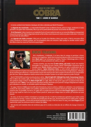 Ce tome contient trois histoires classiques de Cobra colorisées par Buichi Terasawa : La légende des mandrades : La redoutable Elizabeth Tucker ne libérera Secret, prise en otage, seulement si Cobra parvient à récupérer des mandrades, fleurs qui ont la particularité de pousser recouvertes de diamants ! Or et Diamants : Cobra s'aventure sur la planète Dust où il veut mettre la main sur un convoi de diligence transportant cinq cents tonnes d'or. Mais le légendaire pirate se fait arrêter avant de pouvoir mettre son plan à exécution. Comment va-sil se tirer de cette affaire ? La Légende des belles errantes : Cobra est sur la piste d'un fabuleux trésor sous-marin. Il fait la rencontre d'Eris Llyod, étudiante en histoire antique, qui l'accompagnera dans son aventure. Mais quelqu'un semble vouloir mettre des bâtons dans les roues de l'homme au psychogun...