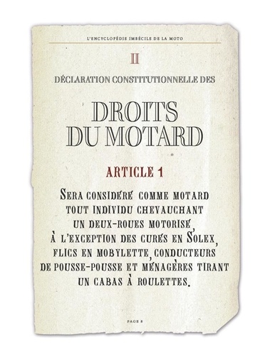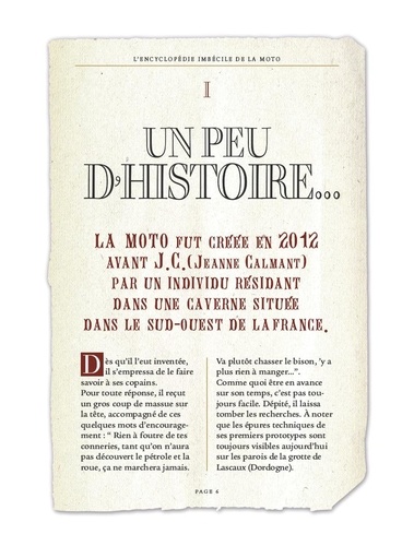 80 pages de trucs et astuces de oufs pour devenir un as de la moto ! Il ne suffit pas d'avoir une moto pour être motard ! Encore faut-il connaître le jargon des spécialistes, leurs us et coutumes ainsi que tous les petits détails indispensables à la survie en deux-roues. Comment éviter un radar ? Qu'est-ce qu'une meule qui pousse velu ? Comment reconnaître un Pur d'un Poireau ? Autant de questions essentielles qui trouveront réponse grâce à cette Encyclopédie Imbécile que l'on est prié, si l'on est un vrai motard, de lire avec les mains graisseuses et la visière baissée. Présentée sous un nouveau format et une nouvelle maquette, la grande oeuvre de Bidault et Bar2 est un pur dérapage contrôlé dans l'humour made in Joe Bar Team, mais aussi un pur ouvrage de passionné, qui fera ronronner de plaisir les adeptes de grosses cylindrées.