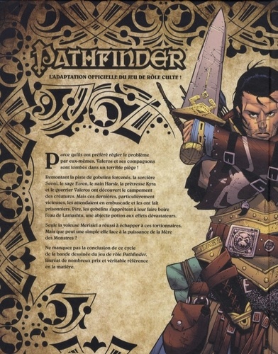 Parce qu'ils ont préféré régler le problème par eux-mêmes, Valeros et ses compagnons sont tombés dans un terrible piège ! Remontant la piste de gobelins forcenés, la sorcière Seoni, le sage Ezren, le nain Harsk, la prêtresse Kyra et le guerrier Valeros ont découvert le campement des créatures. Mais ces dernières, particulièrement vicieuses, les attendaient en embuscade et les ont fait prisonniers. Pire, les gobelins s'apprêtent à leur faire boire l'eau de Lamashtu, une abjecte potion aux effets dévastateurs. Seule la voleuse Merisiel a réussi à échapper à ces tortionnaires. Mais que peut une simple elfe face à la puissance de la Mère des Monstres ?Ne manquez pas la conclusion du premier cycle de la bande dessinée du jeu de rôle Pathfinder, lauréat de nombreux prix et véritable référence en la matière !