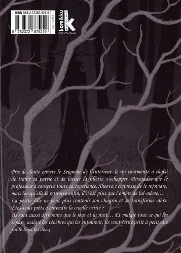 Pris de doute envers le Seigneur de l'Intérieur, le roi tourmenté a choisi de trahir sa patrie et de laisser la fillette s'échapper. Persuadée que le professeur a conservé toute sa conscience, Sheeva s'empresse de le rejoindre, mais lorsqu'elle le retrouve enfin, il n'est plus que l'ombre de lui-même... La petite fille ne peut plus contenir son chagrin et se transforme alors. Etes-vous prêts à entendre la cruelle vérité ? Ils sont aussi différents que le jour et la nuit... Et malgré tout ce qui les sépare, malgré les ténèbres qui les entourent, ils vont écrire petit à petit une fable tous les deux...