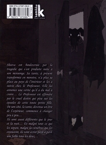 Un conte noir et fantastique entre Tim Burton et The Ancient Magus Bride encensé par la critique et le public ! Sélection officielle du 45e Festival International de la Bande Dessinée d'Angoulême ! Il existe deux mondes : L'Intérieur, où vivent les humains, et L'Extérieur qui est le repaire de créatures maudites. Quiconque serait touché par l'un de ces monstres serait maudit à tout jamais et chassé du pays des hommes. C'est pourtant dans ce monde sombre que vit la petite humaine prénommée Sheeva. Elle a été recueillie par une créature non humaine qu'elle appelle le Professeur. Il veille sur elle et lui interdit tout contact avec les autres créatures de L'Extérieur. Il lui cache la terrible vérité de son abandon et n'ose lui dire que personne ne viendra la chercher... Ils sont aussi différents que le jour et la nuit... Et malgré tout ce qui les sépare, malgré les ténèbres qui les entourent, ils vont écrire petit à petit une fable tous les deux...