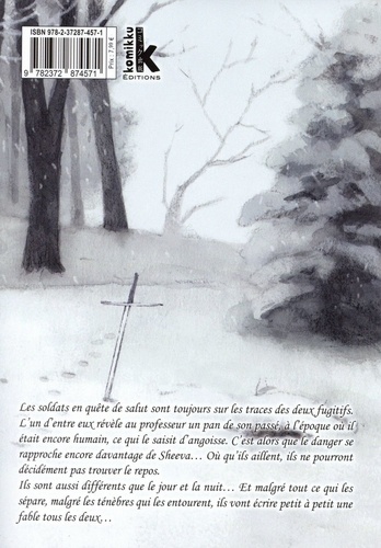 Les soldats en quête de salut sont toujours sur les traces des deux fugitifs. L'un d'entre eux révèle au professeur un pan de son passé, à l'époque où il était encore humain, ce qui le saisit d'angoisse. C'est alors que danger se rapproche encore davantage de Sheeva... Où qu'ils aillent, ils ne pourront décidément pas trouver le repos. Ils sont aussi différents que le jour et la nuit... Et malgré tout ce qui les sépare, malgré les ténèbres qui les entourent, ils vont écrire petit à petit une fable tous les deux...