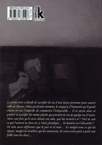 Le professeur a décidé de sacrifier la vie d'une tierce personne pour sauver celle de Sheeva. Mais au dernier moment, le soupçon d'humanité qu'il garde encore en lui l'empêche de commettre l'irréparable... Il se ravise donc et préfère se sacrifier lui-même plutôt que prendre la vie de quelqu'un d'autre. Mais une fois qu'il aura donné son âme, que lui restera-t-il ? Nul ne sait ce qui t'attend au bout de ce choix fatidique... la lumière ou l'obscurité ? Ils sont aussi différents que le jour et la nuit... Et malgré tout ce qui les sépare, malgré les ténèbres qui les entourent, ils vont écrire petit à petit une fable tous les deux...