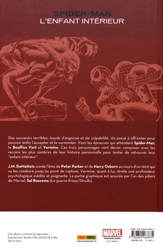 Des souvenirs terribles, lourds d'angoisse et de culpabilité. Un passé à affronter pour pouvoir enfin l'accepter et le surmonter. Voici les épreuves qui attendent Spider-Man, le Bouffon Vert et Vermine. Ces trois personnages vont devoir composer avec les recoins les plus sombres de leur histoire personnelle pour tenter de retrouver leur "enfant intérieur". J. M. DeMatteis sonde l'âme de Peter Parker et de Harry Osborn au cours d'un récit qui va les conduire jusqu'au point de rupture. Vermine, quant à lui, révèle une profondeur psychologique inédite et poignante. La partie graphique est assurée par l'un des piliers de Marvel, Sal Buscema (La guerre Krees/Skrulls).