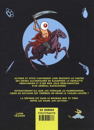 Ultimex et Steve continuent leur descente au centre des enfers accompagnés de Ragenfred, le squelette mérovingien et d'une bien jolie réincarnation d'un général napoléonien. Retrouveront-ils leur ami Stéphane au Pandemonium, coeur du royaume des ténèbres ou règne le taulier Lucifer ? La réponse est dans le bouquin que tu tiens entre les mains. Ami lecteur !