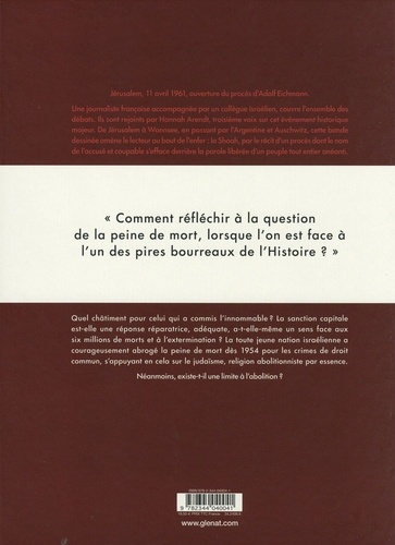 L'héritier du procès de Nuremberg. Adolf Eichmann est l'un des grands architectes de la " solution finale " mise en place par le IIIe Reich. Après la guerre, celui qui a mis tant d'acharnement à organiser et optimiser l'annihilation des juifs parvient à s'exiler en Amérique du Sud où des agents du Mossad le capturent en 1960. Son procès à Jérusalem, l'année suivante, est un événement historique : pour la première fois, les juifs vont eux-mêmes juger officiellement un de leurs bourreaux. Le monde entier a le regard braqué vers la capitale israélienne et les caméras filment l'ensemble de la procédure, du jamais vu. Au cours d'un procès qui dure huit mois, le récit technique de l'industrialisation de la solution finale et les documents d'archives sont présentés, disséqués, commentés. Cent onze rescapés de la Shoah sont appelés à comparaître, chacun d'eux bouleversant l'auditoire. Ce procès judiciaire d'une forte ampleur médiatique et historique - mais également politique - s'enrichit de débats intellectuels, comme le travail d'Hannah Harendt sur la " banalité du mal ". Dans ces mois difficiles, une leçon d'humanité doit passer. Passera-t-elle par une condamnation à mort d'Adolf Eichmann ? L'exécution de celui qui s'est employé à organiser l'extermination de 6 millions d'êtres humains a-t-elle un sens ? Jeanne Amelot, Shimon Abécassis et Hannah Arendt, tous trois présents en tant que journalistes pendant les audiences, s'interrogent. Nouvelle bande dessinée des auteurs de L'Abolition, L'Enfer est vide, tous les démons sont ici en est le prolongement thématique. La réflexion sur la peine de mort se poursuit et s'insère dans un nouveau cadre historique propice au débat et à la discussion en posant la question des limites. Y a-t-il une exception à l'abolition de la peine de mort pour une société s'il s'agit du pire de ses bourreaux ?