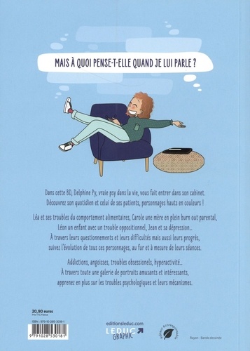 MAIS A QUOI PENSE-T-ELLE QUAND JE LUI PARLE ? Dans cette BD, Delphine Py, vraie psy dans la vie, vous fait entrer dans son cabinet. Découvrez son quotidien et celui de ses patients, personnages hauts en couleurs ! Léa et ses troubles du comportement alimentaires, Carole une mère en plein burn out parental, Léon un enfant avec un trouble oppositionnel, Jean et sa dépression... A travers leurs questionnements et leurs difficultés mais aussi leurs progrès, suivez l'évolution de tous ces personnages, au fur et à mesure de leurs séances. Addictions, angoisses, troubles obsessionels, hyperactivité... Delphine Py est psychologue spécialisée en thérapies cognitives et comportementales. Elle s'est également faite connaître sur les réseaux sociaux où elle oeuvre pour dédramatiser les sujets de santé mentale et rendre la psychologie accessible à tous. Elle est déjà l'autrice du Guide de ta santé mentale. Juliette Mercier, alias @stomiebusy, est illustratrice. Elle est l'autrice des bandes dessinées Ma Crohn de vie et #coupleparfait... ou pas ! chez Leduc Graphic. A travers toute une galerie de portraits amusants et intéressants, apprenez en plus sur les troubles psychologiques et leurs mécanismes.