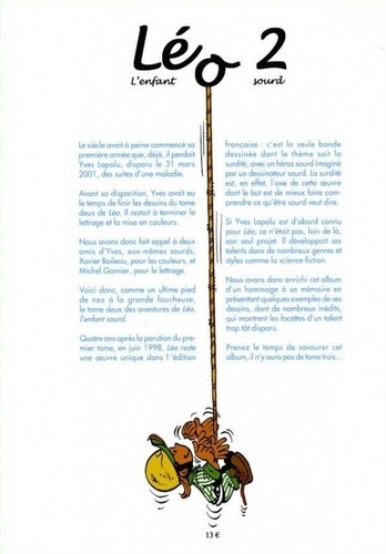 Si Yves Lapalu est d'abord connu pour Léo, ce n'était pas, loin de là, son seul projet. Il développait ses talents dans de nombreux genres et styles comme la science-fiction. Cet album, en hommage à sa mémoire, présente quelques exemples de ses dessins, dont de nombreux inédits, qui montrent les facettes d'un talent trop tôt disparu. Pour la petite histoire : avant sa disparition, en mars 2001, Yves avait eu le temps de finir les maquettes des dessins de ce tome 2 de Léo. Deux de ses amis, eux-mêmes sourds, ont finalisé ce livre : Xavier Boileau, pour les couleurs, et Michel Garnier, pour le lettrage. Voici donc, comme un ultime pied de nez à la grande faucheuse, le tome 2 des aventures de Léo, l'enfant sourd. Prenez le temps de savourer ce second album, avant de découvrir le dernier Léo (Léo retrouvé) édité en 2009.