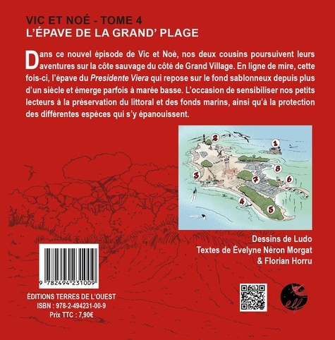 Dans ce nouvel épisode de Vic et Noé, nos deux cousins poursuivent leurs aventures sur la côte sauvage du côté de Grand Village. En ligne de mire, cette fois-ci, l'épave du Presidente Viera qui repose sur le fond sablonneux depuis plus d'un siècle et émerge parfois à marée basse. L'occasion de sensibiliser nos petits lecteurs à la préservation du littoral et des fonds marins, ainsi qu'à la protection des différentes espèces qui s'y épanouissent.