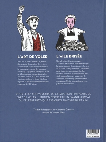 L'ART DE VOLER : A 90 ans. le père d'Altarriba se jette du dernier étage de sa maison de retraite... En relatant par la voix même de celui qui l'a vécue cette traversée des orages qui ont ravagé l'Espagne du siècle passé, le fils rend hommage au courage de son père, aux idéaux vaincus et à l'art si ardu de voler. Classique moderne, ce livre a été élu par le journal El Pais meilleure bande dessinée espagnole du XXIe siècle... L'AILE BRISEE : Une aile brisée, à jamais paralysée à cause de la fureur d'un père rendu fou par la mort en couches de son épouse... Partant de ce secret caché par sa mère à ses intimes, Altarriba achève son diptyque familial, revisitant avec l'aide de Kim le terrible XXe siècle espagnol à travers les portraits de ces mères, filles et compagnes maltraitées, asservies par l'Eglise toute-puissante et un patriarcat de droit divin. POUR LE 10E ANNIVERSAIRE DE LA PARUTION FRANCAISE DE L'ART DE VOLER, L'EDITION COMPLETE EN GRAND FORMAT DU CELEBRE DIPTYQUE ESPAGNOL D'ALTARRIBA ET KIM.