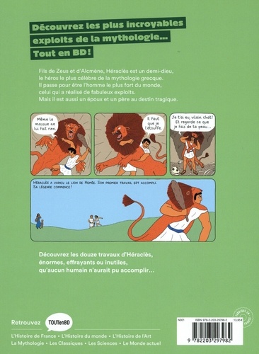 6 chapitres de bande dessinée pour tout savoir sur les douze travaux mythiques ! Au fil des cases et des pages, on apprend comment Héraclès, fils de Zeus, en vient à tuer femme et enfants. On l'accompagne dans les tâches surhumaines qui lui permettront d'expier son crime : capturer le lion de Némée ou le sanglier d'Erymanthe, nettoyer les écuries d'Augias, se rendre aux Enfers, cueillir les pommes d'or du jardin des Hespérides, tuer l'hydre de Lerne... Une BD accessible à tous, riche en scènes d'action, et qui s'attache à rendre au personnage d'Héraclès (Hercule, pour les Romains) sa dimension tragique.