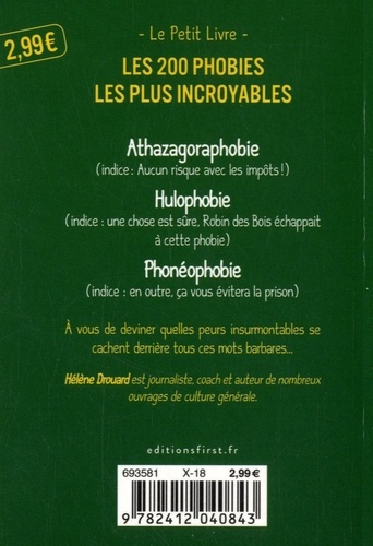 Le petit livre qui décrypte avec humour les phobies les plus incroyables ! La France compterait des millions de phobiques. On a tous nos petites angoisses, mais les phobies sont d'un autre ordre, il s'agit de peurs irrationnelles et démesurées. Tandis que l'arachnophobie, l'agoraphobie ou la claustrophobie sont connues et presque banales, certaines peur restent, en revanche, très confidentielles, voire totalement insolites ! Grâce à ce petit livre, découvrez avec humour les phobies les plus incroyables qui se cachent bien souvent derrière des noms barbares ! Aérodromophobie : peur de l'avion et des voyages en avion. Vous envoyez en l'air, ce n'est pas pour vous ! Algophobie : peur de la douleur. Epouser une anesthésiste ou un morphinomane ? Borbophobie : peur des gargouillements. Evitez la plomberie ! Cénosillicaphobie : peur du verre vide. Travailler dans un bar. Je ne vois que ça ! Entomophobie : peur des insectes. Les géraniums sont vos amis ! Hématophobie : peur du contact et de la vue du sang. Oubliez les films gore ! Orchidophobie : peur des testicules. Si vous êtes un homme, c'est fâcheux. Bon, si vous êtes une femme aussi...