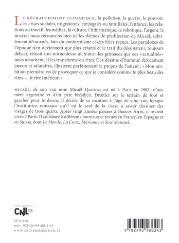 Le réchauffement climatique, la pollution, la guerre, le pouvoir, les crises sociales, migratoires, conjugales ou familiales, l'enfance, les relations au travail, les médias, la culture, l'informatique, la robotique, l'argent, la misère : nous retrouvons bien ici les thèmes de prédilection de Micaël, subtilement détournés, loin du conformisme et des idées reçues. Les paradoxes de l'époque n'en deviennent que plus criants et le trait du dessinateur, toujours délicat, réussit une miraculeuse alchimie : les grimaces que ces "actualités" nous arrachent, il les transforme en rires. Ces dessins d'humour, férocement joyeux et salutaires, illustrent parfaitement le propos de l'auteur : "Mon ambition première est de provoquer ce que je considère comme le plus beau des rires - le rire intérieur."