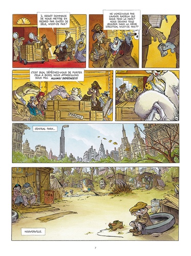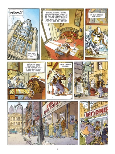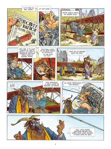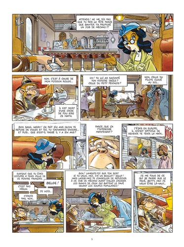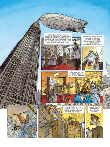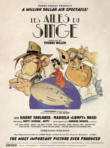 With Harry Faulkner ; Marcelo "Lumpy" Rossi ; Introducing Betty Laverne as Betty ; Special appearance of Howard Hughes as himself ; with Lydia Lessing ; Donald "Big Beak" Fischer ; Hans Stolzheim ; David "Walrus" Rats ; Bulldog Pol ; Clara Palmer ; Puffin Jeaves ; Emilio Van Der Zuiden ; Caroline Pareggio (The running girl). Operation Wakanda. Story, dialogs and visuals created by Etienne Willem according to his novel Un singe en Amérique — ed. Paquet.