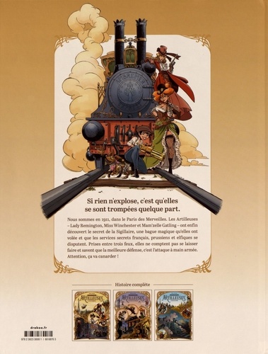 Si rien n'explose, c'est qu'elles se sont trompées quelque part. Nous sommes en 1911, dans le Paris des Merveilles. Les Artilleuses - Lady Remington, Miss Winchester et Mam'zelle Gatling - ont enfin découvert le secret de la Sigillaire, une bague magique qu'elles ont volée et que les services secrets français, prussiens et elfiques se disputent. Prises entre trois feux, elles ne comptent pas se laisser faire et savent que la meilleure défense, c'est l'attaque à main armée. Attention, ça va canarder !