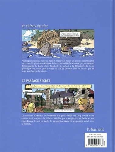 Retrouvez dans cet album deux histoires du club le plus célèbre de la littérature jeunesse, scénarisées par Nataël et dessinées par Béja ! Le Club des cinq et le passage secret : Les vacances à Kernach se présentent mal pour le Club des Cinq. Claude et ses cousins sont bloqués à la maison : ils ont eu de mauvais résultats scolaires et M. Rolland, un professeur particulier, est là pour les faire travailler. Mais les quatre enquêteurs en herbe sont en alerte. Ils viennent de découvrir un passage secret, sous la maison... Le Club des cinq et le trésor de l'île : Pour la première fois, François, Mick et Annie vont passer les grandes vacances chez leur tante. Ils y font connaissance de leur cousine Claude, un vrai garçon manqué. Accompagnés du fidèle chien Dagobert, ils partent à la découverte du trésor qu'indique une vieille carte trouvée sur l'île de Kernach. Ils doivent faire vite, car ils ne sont pas les seuls à rechercher le trésor...