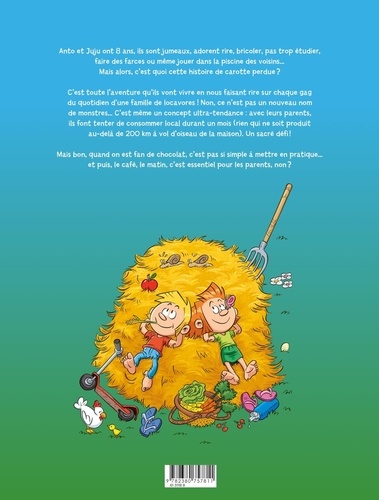 Anto et Juju ont 8 ans, ils sont jumeaux, adorent rire, bricoler, pas trop étudier, faire des farces ou même jouer dans la piscine des voisins... Mais alors, c'est quoi cette histoire de carotte perdue ? C'est toute l'aventure qu'ils vont vivre en nous faisant rire sur chaque gag du quotidien d'une famille de locavores ! Non, ce n'est pas un nouveau nom de monstres... C'est même un concept ultra-tendance : avec leurs parents, ils font tenter de consommer local durant un mois (rien qui ne soit produit au-delà de 200 km à vol d'oiseau de la maison). Un sacré défi ! Mais bon, quand on est fan de chocolat, c'est pas si simple à mettre en pratique... et puis, le café, le matin, c'est essentiel pour les parents, non ?