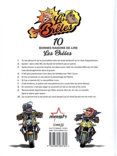 10 bonnes raisons de lire Les Brêles 1. Tu vas découvrir qu'un journaliste moto est aussi productif qu'un chat d'appartement. 2. Spoil : Dans cette BD les Ducati ne tombent pas en panne. 3. Après lecture tu pourras recycler cet album pour caler tes meubles Ikéa qui ont déjà trois déménagements dans la gueule. 4. C'est plus passionnant à lire dans les toilettes que Télé7jours. 5. Si t'es un boomer, tu vas adorer le personnage de Patrick. 6. Si t'as un permis A2, tu vas préférer Luca. 7. C'est moderne, le patron est une patronne (on a voulu faire les bons élèves). 8. En revanche c'est pas végan et ça picole (en fait on est des p'tits cons). 9. Recommandé objectivement par Moto Journal, bon ok en vrai on travaille dans le même open space. 10. Ca va donner tort à nos profs qui nous disaient qu'on ferait jamais rien de notre vie.
