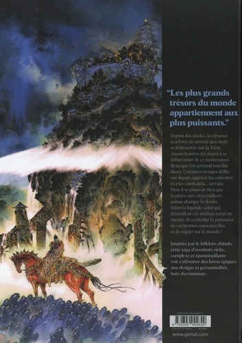 A la recherche de la pierre aux cinq couleurs. Depuis des siècles, les brumes écarlates ne sèment que mort et destruction sur la Terre. Aucun homme n'a réussi à se débarrasser de ce monstrueux fléau que l'on prétend issu des dieux. Même si certaines troupes d'élite ont depuis appris à les connaître et à les combattre... en vain. Mais il se pourrait bien qu'un artefact nommé la "pierre aux cinq couleurs" puisse changer la donne. Car selon la légende, celui qui détiendrait la pierre serait en mesure de contrôler la puissance de ces brumes surnaturelles et de régner sur le monde ! Qui de Wuding, le fossoyeur de dieux et son groupe de rebelles, Di Shu, son excentrique rival, ou des puissances des royaumes de Tieliu, Qingqiu ou Danzhu parviendra à mettre la main dessus ? Et dans l'ombre, qu'est-ce que manigancent les mystérieuses forces à l'origine de cette chasse à la pierre ? Récit de fantasy inspiré du folklore chinois, Les Brumes Ecarlates est porté par un dessin virtuose, fourmillant, précis et expressif qui s'embellit d'incroyables ambiances colorées et chatoyantes. Un deuxième volume qui vient préciser et enrichir l'univers complexe et foisonnant de cette saga d'aventures époustouflante où s'affrontent des héros épiques aux design et personnalités hors du commun.