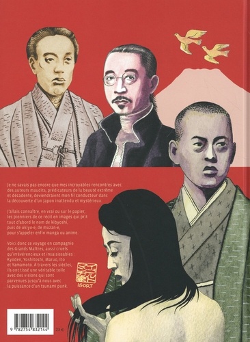 Je ne savais pas encore que mes incroyables rencontres avec des auteurs maudits, prédicateurs de la beauté extrême et décadente, deviendraient mon fil conducteur dans la découverte d'un Japon inattendu et mystérieux, l'allais connaitre, en vrai ou sur le papier, les pionniers de ce récit en images qui prit tout d'abord le nom de kibyoshi, puis de ukiyo-e, de muzame, pour s'appeler enfin manga ou anime. Voici donc ce voyage en compagnie des Grands Maitres, aussi cruels qu'irrévérencieux et insaisissables : Kyoden, Yoshitoshi, Maruo, Ito et Yamamoto, A travers les siècles, ils ont tissé une véritable toile avec des visions qui sont parvenues jusqu'à nous avec la puissance d'un tsunami punk.