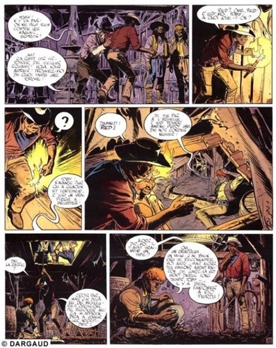 Au ranch Triple Six, Red Dust et Comanche préparent leurs chevaux pour la foire de Laramie, tout en essayant d'apprendre les travaux de la ferme à Feu d'orage et Torrent d'été, deux jeunes Indiens recherchés pour avoir refusé de réintégrer leur réserve. L'apprentissage ne va pas sans mal, les deux braves rechignant à faire des travaux de squaws comme traire une vache, repeindre un mur ou planter des piquets de clôture. Mais les hommes de Fergus Longsdale passent par là. Ils poursuivent des voleurs de bétail et ils pourraient bien repérer les deux jeunes Indiens. Pour les cacher, le vieux Ten a une idée : les cabanes en ruine du Rio perdu, vestiges de l'époque où, vingt ans plus tôt, l'Irlandais Sullivan avait trouvé deux pépites dans le Rio. Ce qui avait donné une mémorable ruée vers l'or avec ville-champignon, jeux, filles, alcools et explosion finale à la dynamite, histoire d'accélérer un peu le rendement. Résultat : la moitié de la montagne en poussière, dix-sept morts et le Rio avalé par la terre - d'où sa nouvelle appellation de Rio perdu. C'est dans cette ville fantôme que vont se produire quelques événements pour le moins étonnants : la résurrection d'un grand costaud appelé Le Bison, mort depuis vingt ans d'une balle dans le crâne, un déferlement spectaculaire de bétail volé dans les souterrains de la ville, et le retour du fameux Rio perdu... "Que Jupiter m'envoie sa foudre ! " comme dit le vieux Ten qui a tout vu dans sa vie "sauf la crucifixion et la retraite de Russie". Greg nous donne encore une fois un scénario solide et riche en morceaux de bravoure qui donnent à Rouge l'occasion d'exprimer ses talents dans un registre proche de celui de Giraud, pour cette série phare du western.