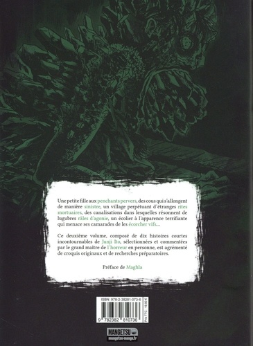 Une petite fille aux penchants pervers, des cous qui s'allongent de manière sinistre, un village perpétuant d'étranges rites mortuaires, des canalisations dans lesquelles résonnent de lugubres râles d'agonie, un écolier à l'apparence terrifiante qui menace ses camarades de les écorcher vifs... Ce deuxième volume, composé de dix histoires courtes incontournables de Junji Ito, sélectionnées et commentées par le grand maître de l'horreur en personne, est agrémenté de croquis originaux et de recherches préparatoires.
