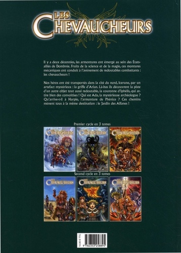 Il y a deux décennies, les armontures ont émergé au sein des Etats- alliés de Dombrée. Fruits de la science et de la magie, ces montures mécaniques ont conduit à l'avènement de redoutables combattants : les chevaucheurs ! Nos héros ont été transportés dans la cité du nord, Icerune, par un artefact mystérieux : la griffe d'Arian. Là-bas ils découvrent la piste d'un autre objet tout aussi redoutable, la couronne d'Iphélis, qui attire bien des convoitises ! Qui est Ada, la mystérieuse archéologue ? Qu'arrive-t-il à Harpie, l'armonture de Phénice ? Ces chemins mènent tous à la même destination : le Jardin des Alfanes !