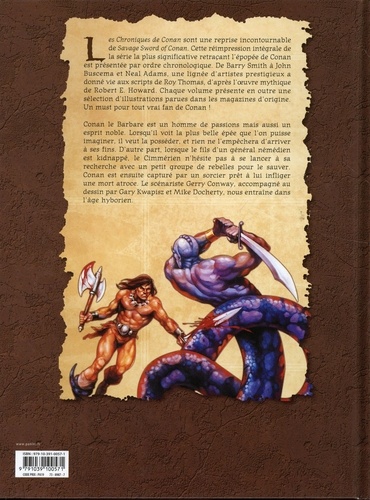 Les Chroniques de Conan sont une reprise incontournable de Savage Sword of Conan. Cette réimpression intégrale de la série la plus significative retraçant l'épopée de Conan est présentée par ordre chronologique. De Barry Smith à John Buscema et Neal Adams, une lignée d'artistes prestigieux a donné vie aux scripts de Roy Thomas, d'après l'oeuvre mythique de Robert E. Howard. Chaque volume présente en outre une sélection d'illustrations parues dans les magazines d'origine. Un must pour tout vrai fan de Conan ! Conan le Barbare est un homme de passions mais aussi un esprit noble. Lorsqu'il voit la plus belle épée que l'on puisse imaginer, il veut la posséder, et rien ne l'empêchera d'arriver à ses fins. D'autre part, lorsque le fils d'un général némédien est kidnappé. le Cimmérien n'hésite pas à se lancer à sa recherche avec un petit groupe de rebelles pour le sauver. Conan est ensuite capturé par un sorcier prêt à lui infliger une mort atroce. Le scénariste Gerry Conway, accompagné au dessin par Gary Kwapisz et Mike Docherty, nous entraîne dans l'àge hyborien.