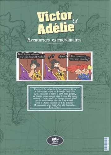 Les aventures trépidantes de deux enfants pourchassés par des malfaiteurs qui tentent de les enlever. Victor et Adélie partent à la recherche de leurs parents explorateurs en Amérique du Sud. En effet, ces derniers sont sur la piste d'une source d'énergie qui pourrait changer le monde, ce qui intéresse beaucoup gouvernements et malfrats... Nos jeunes héros embarquent alors au Havre, sur le Caracas, en se mêlant à une excentrique famille nombreuse. Cependant, ils sont suivis par un étrange homme enturbanné, qu'ils tentent de piéger pour s'en débarrasser. La série se déroule quelques années avant Sacré Coeur. Des détails seront dissimulés dans les illustrations. Ouvrez l'oeil ! Toujours à la recherche de leurs parents, Victor et Adélie sont arrivés au Patanaya. Mais alors qu'ils remontent le fleuve à bord d'une pirogue, un étrange oiseau apparais dans le ciel. Un oiseau, vraiment ? Non, plutôt un étrange appareil piloté par le machiavélique chef des Cinq Crânes ! Victor et Adélie réussiront--ils à lui échapper ? Ils pourraient avoir l'aide d'un allié inattendu...