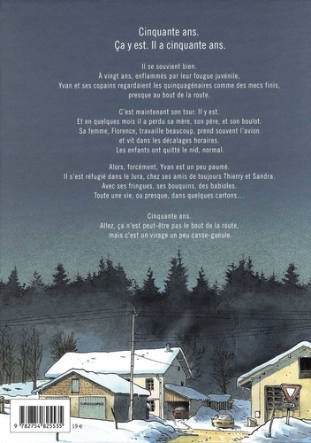 Cinquante ans. Ca y est. Il a cinquante ans. Il se souvient bien. A vingt ans, enflammés par leur fougue juvénile, Yvan et ses copains regardaient les quinquagénaires comme des mecs finis, presque au bout de la route. C'est maintenant son tour. Il y est. Et en quelques mois il a perdu sa mère, son père, et son boulot. Sa femme, Florence, travaille beaucoup, prend souvent l'avion et vit dans les décalages horaires. Les enfants ont quitté le nid, normal. Alors, forcément, Yvan est un peu paumé. Il s'est réfugié dans le Jura, chez ses amis de toujours Thierry et Sandra. Avec ses fringues, ses bouquins, des babioles. Toute une vie, ou presque, dans quelques cartons... Cinquante ans. Allez, ça n'est peut-être pas le bout de la route, mais c'est un virage un peu casse-gueule.
