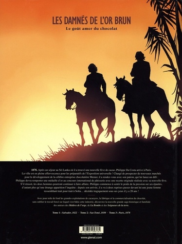 1878. Après un séjour au Sri Lanka où il a trouvé une nouvelle fève de cacao, Philippe Da Costa arrive à Paris. La ville est en pleine effervescence pour les préparatifs de l'Exposition universelle ! Chargé de prospecter de nouveaux marchés pour le développement de la célèbre entreprise chocolatière Menier, il a rendez-vous avec son patron, qui lui lance un défi Philippe devra remporter une médaille d'or au concours international de pâtisserie avec une recette originale réalisée avec sa nouvelle fève. S'il réussit, les deux hommes pourtant continuer à faire affaire. Philippe commence à sentir le poids de la pression sur ses épaules, d'autant plus qu'une étrange apparition l'inquiète : depuis son arrivée, il a vu à deux reprises passer devant lui une jeune femme ressemblant trait pour trait à Sofia.., décédée tragiquement sous ses yeux il y a 28 ans Avec pour toile de fond les grandes exploitations de cacaoyers, la fabrique et la commercialisation du chocolat, sans oublier le travail forcé sur lequel s'est Hue cette industrie, découvrez la nouvelle grande saga historique et familiale des auteurs des Maîtres de l'orge, de la Bombe et des Seigneurs de la terre.