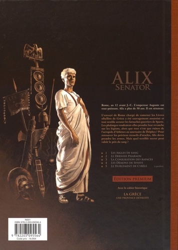 Rome, an 12 avant J. -C. L'empereur Auguste est tout-puissant. Alix a plus de 50 ans. Il est sénateur. L'envoyé de Rome chargé de ramener les Livres sibyllins de Grèce a été sauvagement assassiné et tout semble accuser les farouches guerriers de Sparte. Les phalanges voudraient-elles prendre leur revanche sur les légions, alors que tout n'est que ruines de l'acropole d'Athènes au sanctuaire de Delphes ? Pour retrouver les précieux recueils d'oracles, Alix devra prendre les armes. Mais quel terrible secret peut valoir le prix du sang ?