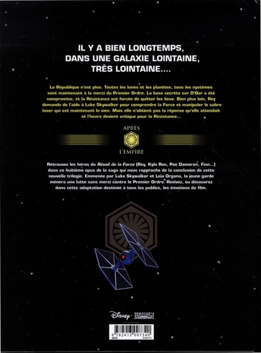 Il y a bien longtemps, dans une galaxie lointaine, très lointaine.... La République n'est plus. Toutes les lunes et les planètes, tous les systèmes sont maintenant à la merci du Premier Ordre. La base secrète sur D'Qar a été compromise, et la Résistance est forcée de quitter les lieux. Bien plus loin, Rey demande de l'aide a Luke Skywalker pour comprendre la Force et manipuler le sabre laser qui est maintenant le sien. Mais elle n'obtient pas la réponse qu'elle attendait et l'heure devient critique pour la Résistance... Retrouvez les héros du Réveil de la Farce (Rey, Kylo Ren, Poe Dameron, Finn...) dans ce huitième opus de la saga qui nous rapproche de la conclusion de cette nouvelle trilogie. Emmenée par Luke Skywalker et Leia Organa, la jeune garde mènera une lutte sans merci contre le Premier Ordre. Revivez, au découvrez dans cette adaptation destinée à tous les publics, les émotions du film.