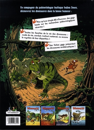 En compagnie du paléontologue loufoque Indino Jones, découvrez les dinosaures dans la bonne humeur : plus qu'une simple BD d'humour, des gags basés sur les recherches paléontologiques récentes ! Toutes les facettes de la vie des dinosaures : mode de vie, combat, instinct maternel, ou encore le mystère de leur disparition ! Des fiches gags présentant les dinosaures emblématiques !