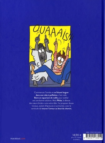 Une jeune femme pétillante et amoureuse est lâchement quittée le soir du réveillon du nouvel an, par son homme qui, au bout de cinq ans de relation, lui assène : "c'est quoi l'amour ? " . Il s'en suit une dépression et une nuit d'ivresse pendant laquelle surgit Philae, une déesse grecque qui lui propose douze épreuves pour trouver l'amour. Ce récit se déroule sur une année. Philae l'éprouve en lui imposant les douze défis suivants : tester les applis, boire beaucoup, rappeler ses ex, essayer les filles, se réjouir pour les autres, résister à l'homme marié, faire n'importe quoi avec ses cheveux, croiser l'ex un jour de cheveux sales, supporter les réunions de famille, résister au retour de l'ex, ne pas avoir la peur de finir en vieille dame à chat, ne pas foirer la prochaine relation. Philae, sorte de double bienveillant, restera à ses côtés pendant ses douze râteaux. Entre rire et larmes, le personnage principal va pouvoir avancer dans ses phases de deuil, jusqu'à la rédemption. A la fin, Philae va révéler son vrai visage...
