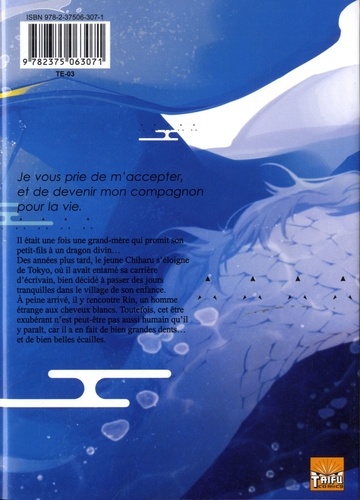 Je vous prie de m'accepter, et de devenir mon compagnon pour la vie. Il était une fois une grand-mère qui promit son petit-fils à un dragon divin... Des années plus tard, le jeune Chiharu s'éloigne de Tokyo, où il avait entamé sa carrière d'écrivain, bien décidé à passer des jours tranquilles dans le village de son enfance. A peine arrivé, il y rencontre Rin, un homme étrange aux cheveux blancs. Toutefois, cet être exubérant n'est peut-être pas aussi humain qu'il y parait, car il a en fait de bien grandes dents... et de bien belles écailles.