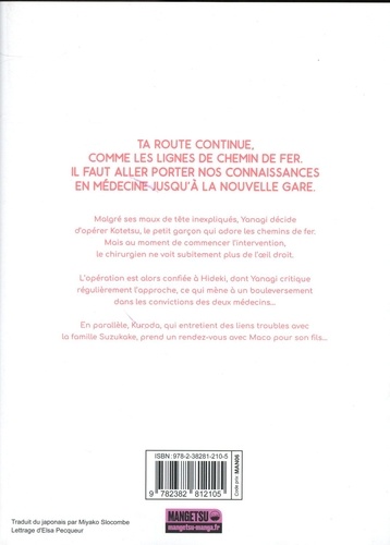 Conscient de l'enjeu pour Yanagi, atteint de l'oeil droit, Hideki s'attelle à une intervention chirurgicale inédite pour sauver Kotetsu. Les deux opérations menées par le grand frère de Maco se concluront-elles par un succès ou un échec ? En parallèle, la clinique de Kitahiroshima voit l'arrivée d'un mystérieux individu, du nom de Kuroda, qui aurait un lien avec la famille Suzukake... Après Le Bateau de Thésée, Toshiya Higashimoto revient avec une nouvelle oeuvre pleine d'humanité portée par un héros sincère au grand coeur.
