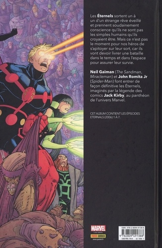 Les Eternels sortent un à un d'un étrange rêve éveillé et prennent soudainement conscience qu'Us ne sont pas les simples humains qu'ils croyaient être. Mais ce n'est pas le moment pour nos héros de s'apitoyer sur leur sort, car ils vont devoir livrer une bataille dans le temps et dans l'espace pour assurer leur survie. Neil Gaiman (The Sandman, Miracleman) et John Romita Jr (Spider-Man) font entrer de façon définitive les Eternels, imaginés par la légende des comics Jack Kirby, au panthéon de l'univers Marvel. Cet album contient les épisodes Eternals (2006) 1 à 7.