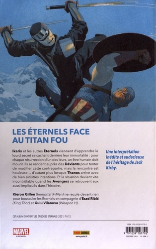 Une interprétation inédite et audacieuse de l'héritage de Jack Kirby. Ikaris et les autres Eternels viennent d'apprendre le lourd secret se cachant derrière leur immortalité : pour chaque résurrection d'un des leurs, un être humain doit mourir. Ils se rendent auprès des Déviants pour tenter de modifier cette contrepartie, mais la rencontre est houleuse... d'autant plus lorsque Thanos arrive avec de bien sinistres intentions. Et la situation devient vite incontrôlable quand les Avengers se retrouvent eux aussi impliqués dans l'histoire. Kieron Gillen (Immortel X-Men) ne recule devant rien pour bousculer les Eternels en compagnie d'Esad Ribic (King Thor) et Guiu Vilanova (Weapon H).