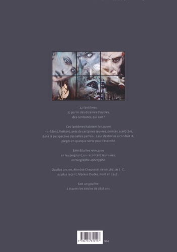 22 fantômes. 22 parmi des dizaines d'autres, des centaines, qui sait ? Ces fantômes habitent le Louvre. Ils rôdent, flottent, près de certaines oeuvres, peintes, sculptées, dans la perspective des salles parfois... Leur destin les a conduit là, piégés en quelque sorte pour l'éternité. Enki Bilal les réincarne en les peignant, en racontant leurs vies, en biographe apocryphe. Du plus ancien, Ahmôsé Chepseset né en 1891 avant JC, au plus récent, Markus Dudke, mort en 1947... Soit un gouffre à travers les siècles de 3838 ans.