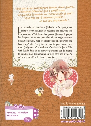 Voici que je suis maintenant témoin d'une guerre... J'aimerais tellement que le conflit cesse et que tout le monde en revienne sain et sauf ! Mais cela est-il vraiment possible ? Je me sens impuissante ! La nouvelle est tombée : Nadasha a fait partir ses troupes pour attaquer le Royaume des dragons. Les deux pays sont officiellement en guerre. Bien que le peuple des dragons ne semble pas alarmé par cette invasion, bien au contraire, Ruri est inquiète car elle apprend par Joshua qu'Asahi s'est jointe à l'armée pour sauver son amie. Craignant qu'un malheur n'arrive à la jeune fille, Ruri décide donc de se rendre également sur le champ de bataille. Mais les humains ont peut-être une stratégie spéciale pour affronter leurs ennemis...