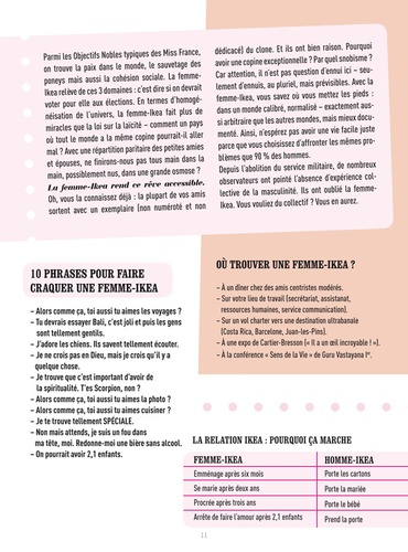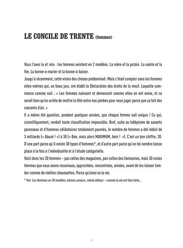 Pour chaque femme, Maïa Mazaurette dresse un profil complet avec texte de présentation, tableau de ce qu'elle apporte à l'homme compatible, notice d'utilisation (ce qu'elle mange, son habitat, ses habitudes) et un bonus spécifique comme une phrase d'accroche pour la pécho ou l'avis du psy. Une typologie de 30 femmes décortiquées avec humour, fantaisie et impertinence.