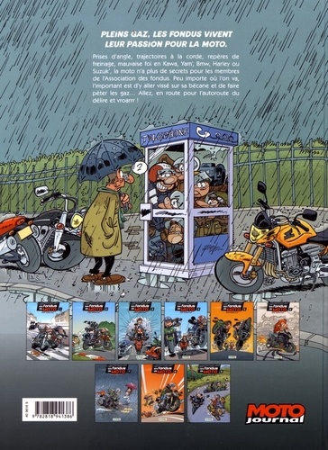 La série qui carbure à l'humour ! Ca carbure sévère du côté du local de l'Association des fondus ! Les plus belles bécanes, vintage et chromées comme il se doit, sont réunies pour une nouvelle équipée sauvage des fondus de moto. Alors accrochez-vous bien et ne manquez pas des aventures plus motardes que jamais !