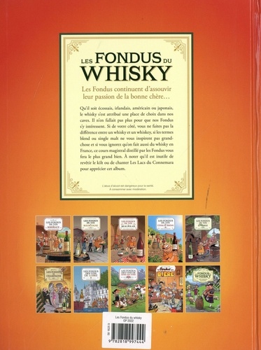 Les Fondus continuent d'assouvir leur passion de la bonne chère... Qu'il soit écossais, irlandais, américain ou japonais, le whisky s'est attribué une place de choix dans nos caves. Il n'en fallait pas plus pour que nos Fondus s'y intéressent. Si de votre côté, vous ne faites pas la différence entre un whisky et un whiskey, si les termes blend ou single malt ne vous inspirent pas grand-chose et si vous ignorez qu'on fait aussi du whisky en France, ce cours magistral distillé par les Fondus vous fera le plus grand bien. A noter qu'il est inutile de revêtir le kilt ou de chanter Les Lacs du Connemara pour apprécier cet album. Inclus : un dossier de 10 pages rédigé par le distillateur Etienne Bouillon.