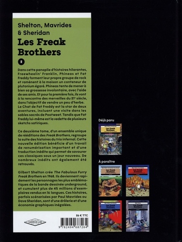 Dans cette panoplie d'histoires hilarantes, Freewheelin' Franklin, Phineas et Fat Freddy forment leur propre groupe de rock et ramènent à la maison un conteneur de plutonium égaré. Phineas tente de mener à bien sa grossesse involontaire, avec l'aide de ses amis. Et pour la première fois, ils vont à la rencontre des merveilles du 21e siècle, dans l'objectif de vendre un peu d'herbe. Le Chat de Fat Freddy est la star de deux aventures, incluant une visite dans les sables sacrés de Pootweet. Tandis que Fat Freddy lui-même est la vedette de plusieurs sketchs satiriques. Ce deuxième tome, d'un ensemble unique de rééditions des Freak Brothers, regroupe la suite des histoires du trio infernal. Cette nouvelle édition bénéficie d'un travail de renumérisation important et d'une traduction inédite qui permet de savourer ces classiques sous un jour nouveau. De nombreux inédits ont également été retrouvés. Gilbert Shelton crée The Fabulous Furry Freak Brothers en 1968. Ils deviennent rapidement les personnages les plus emblématiques de la bande dessinée underground, et cumulent plus de 45 millions d'exemplaires vendus en 16 langues. Ces histoires, parfois scénarisées par Paul Mavrides ou Dave Sheridan, sont d'une drôlerie et d'une économie graphiques inégalées.