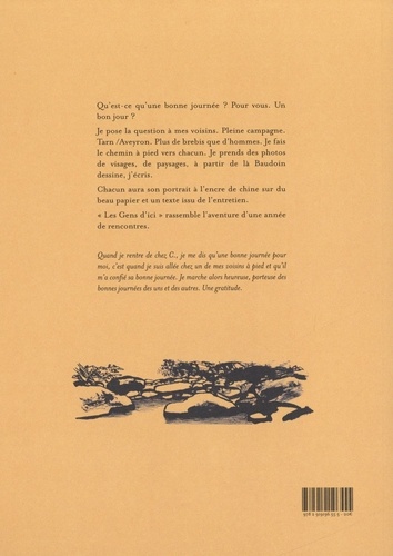 Lors du premier confinement Edmond Baudoin a quitté Paris pour rendre visite à Carol Vanni en pleine campagne Tarnaise. La bâtisse est seule sur la colline, les portables ne passent pas vraiment. Plus de brebis que d'hommes. Les chouettes la nuit et l'aboiement déchirant des chevreuils. Au fil de ces deux mois, ils se demandent ce que c'est que d'habiter quelque part, d'être en lien avec un endroit et ses voisins. Pendant presque une année Carol a été, souvent à pied, entre les confinements, à la rencontre de ses voisins. Elle les interroge sur ce qu'est une bonne journée. Elle enregistre la réponse qu'elle réécrit plus tard puis Baudoin dessine les portraits et les paysages. Chacun aura son portrait à l'encre de chine sur du beau papier et un texte issu de l'entretien. Ensemble ils sont allés sur des territoires intimes : être voisin géographiquement et devenir voisin humainement.