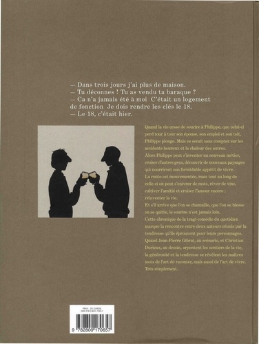 Quand la vie cesse de sourire à Philippe, que celui-ci perd tour à tour son épouse, son emploi et son toit, Philippe plonge. Mais ce serait sans compter sur les accidents heureux et la chaleur des autres. Alors Philippe peut s'inventer un nouveau métier, croiser d'autres gens, découvrir de nouveaux paysages qui nourriront son formidable appétit de vivre. La route est mouvementée, mais tout au long de celle-ci on peut s'enivrer de mots, rêver de vins, cultiver l'amitié et croiser l'amour encore : réinventer la vie. Et s'il arrive que l'on se chamaille, que l'on se blesse ou se quitte, le sourire n'est jamais loin. Cette chronique de la tragi-comédie du quotidien marque la rencontre entre deux auteurs réunis par la tendresse qu'ils éprouvent pour leurs personnages. Quand Jean-Pierre Gibrat, au scénario, et Christian Durieux, au dessin, arpentent les sentiers de la vie, la générosité et la tendresse se révèlent les maîtres mots de l'art de raconter, mais aussi de l'art de vivre. Très simplement.